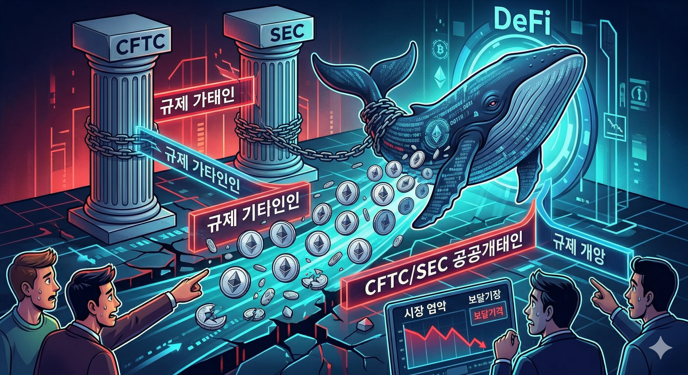 오늘부터 미국 CFTC와 SEC의 공동 가이드라인이 발효되었습니다. 규칙이 명확해지는 건 장기적으로 호재지만, 당장 시장은 눈치싸움에 들어갔습니다. 여기에 이더리움 고래 한 마리가 부채 상환을 위해 약 1,000만 달러어치의 ETH를 매도했다는 소식까지 들려오며 심리를 더 위축시켰죠.