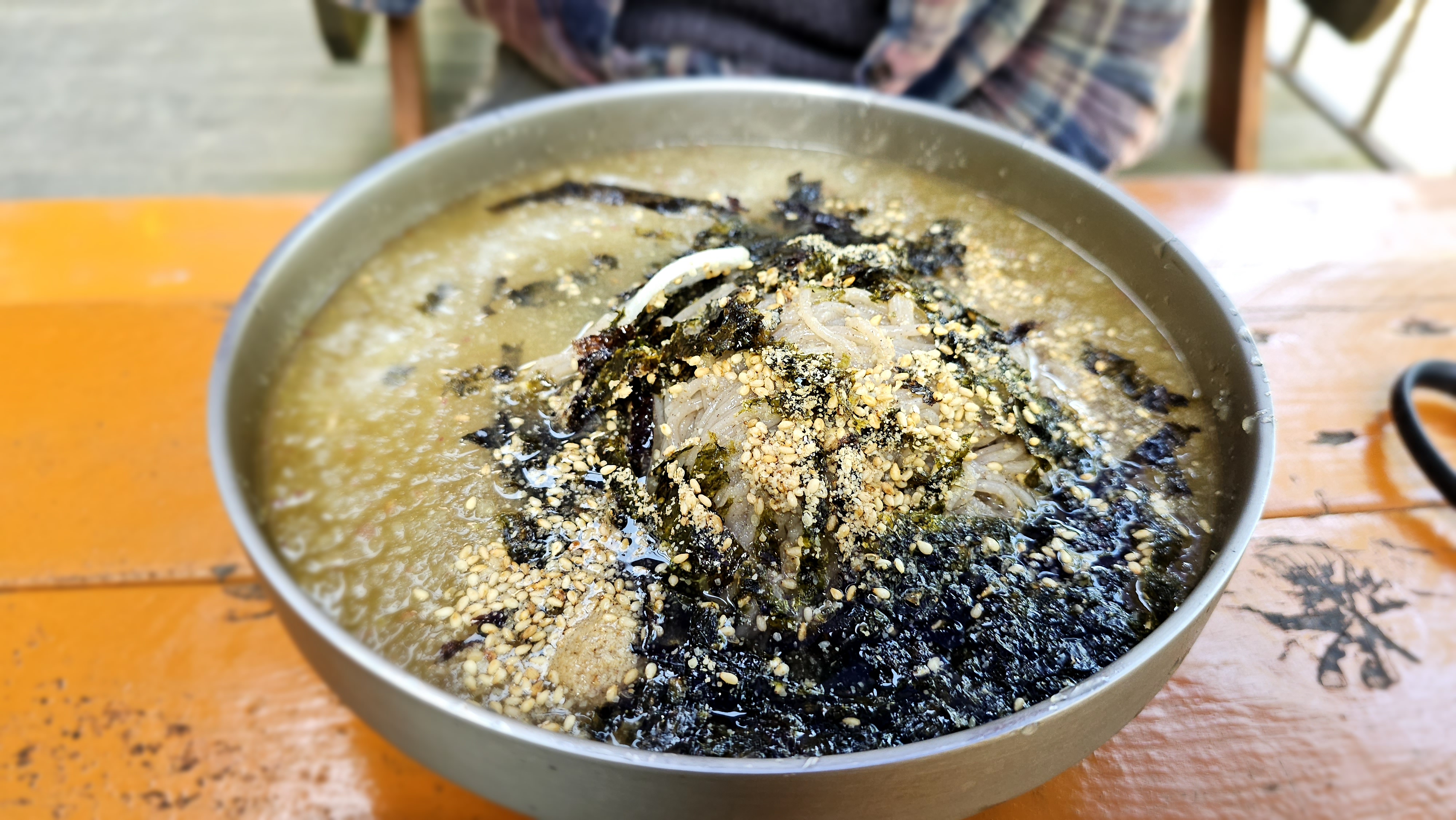 비빔막국수는 양념이 맛있고 면이 탱글탱글합니다. 매콤하면서도 메밀면 특유의 쫄깃하고 부드러운 식감이 매력적입니다. 고소한 김가루가 듬뿍 올려져 나오고, 참기름 향이 강하게 느껴져 고소한 맛이 일품입니다. 비빔막국수를 주문하면 살얼음 육수가 함께 제공되어, 이를 추가하면 더욱 시원하고 새콤한 맛을 즐길 수 있습니다. 일반 비빔냉면만큼 자극적이지 않으면서도 건강한 맛을 느낄 수 있습니다.